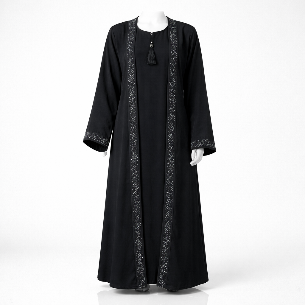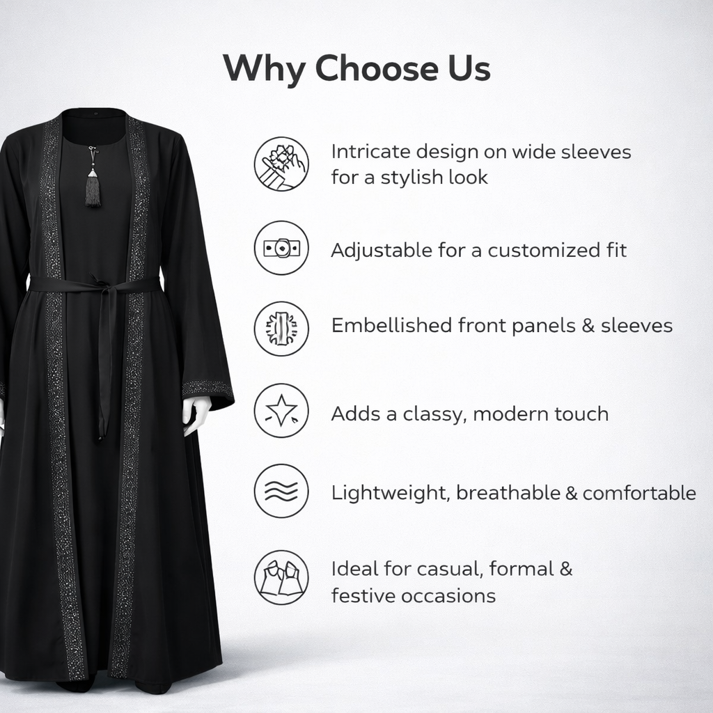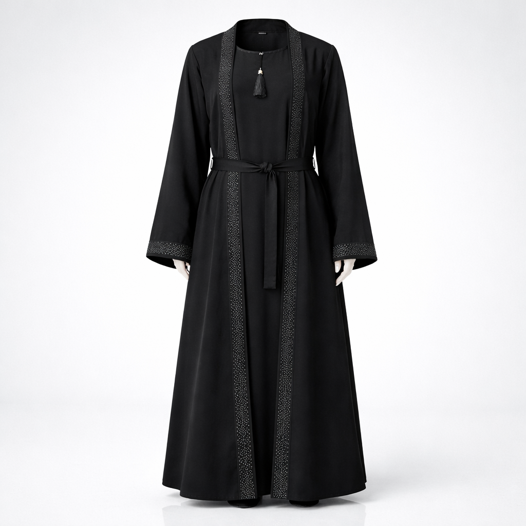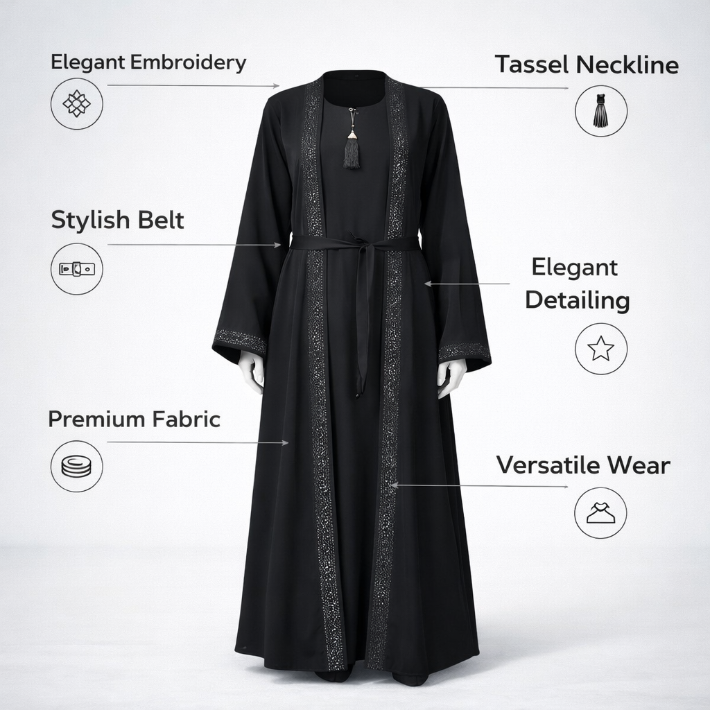 The abaya is beautifully detailed with subtle embellishments along the front panels and sleeves, while the adjustable waist belt allows you to style it according to your preference—either loose or fitted. The inner includes a chic tassel neckline, adding a refined touch to your overall appearance.