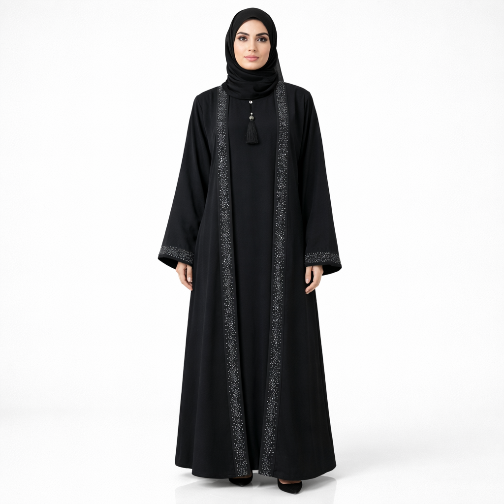 Enhance your modest wardrobe with this Elegant Black Belted Abaya with Inner, designed for modern women in Pakistan who love a blend of sophistication and comfort. This stylish 2-piece abaya features a front open design with a matching inner, giving you a layered, graceful look.