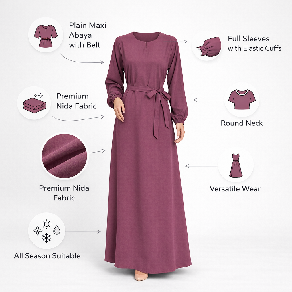 • Elegant Maxi Design: Plain abaya with a modern mauve color for a classy and modest look