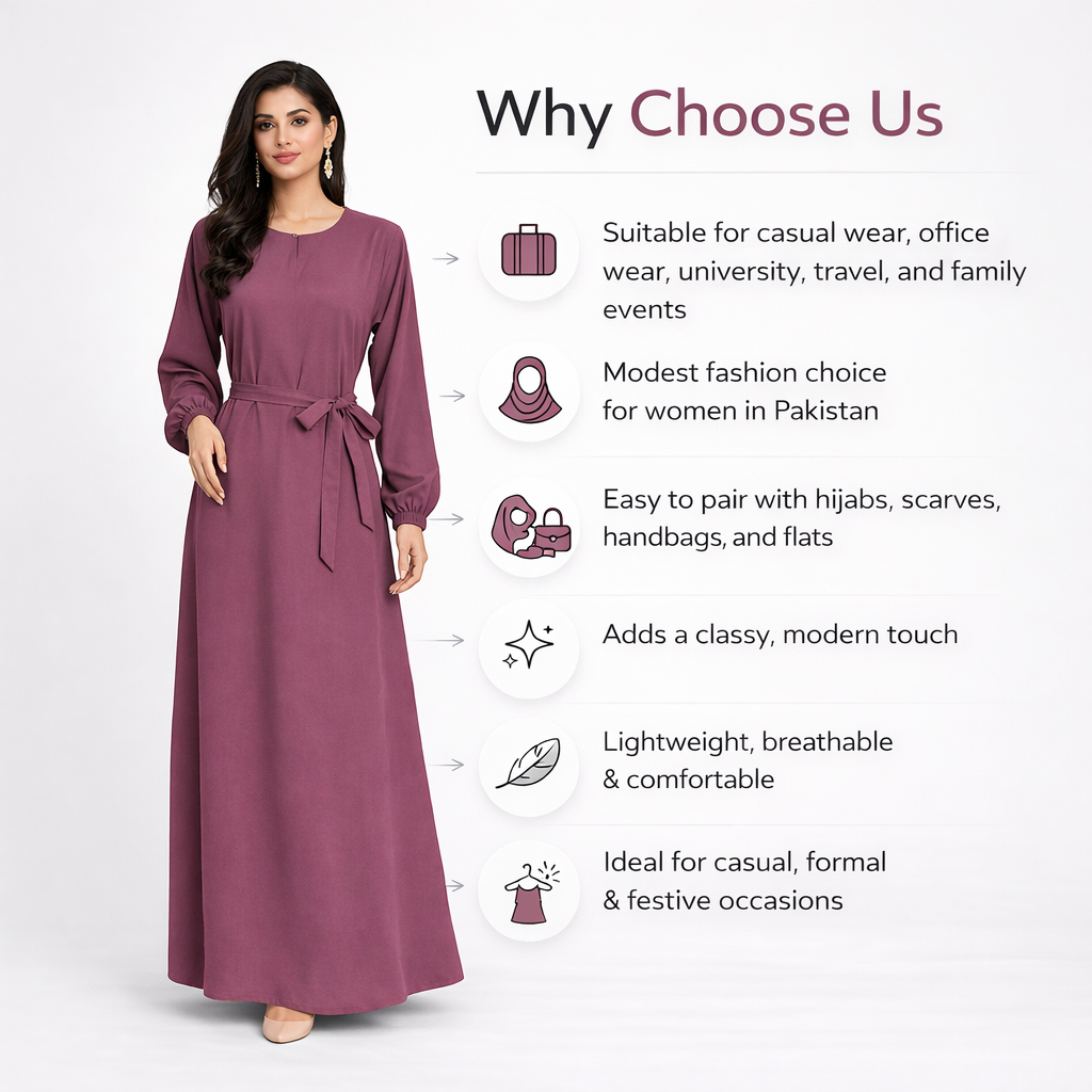 Whether you’re heading to university, office, family gatherings, or traveling, this belted abaya dress is your go-to choice for effortless style.