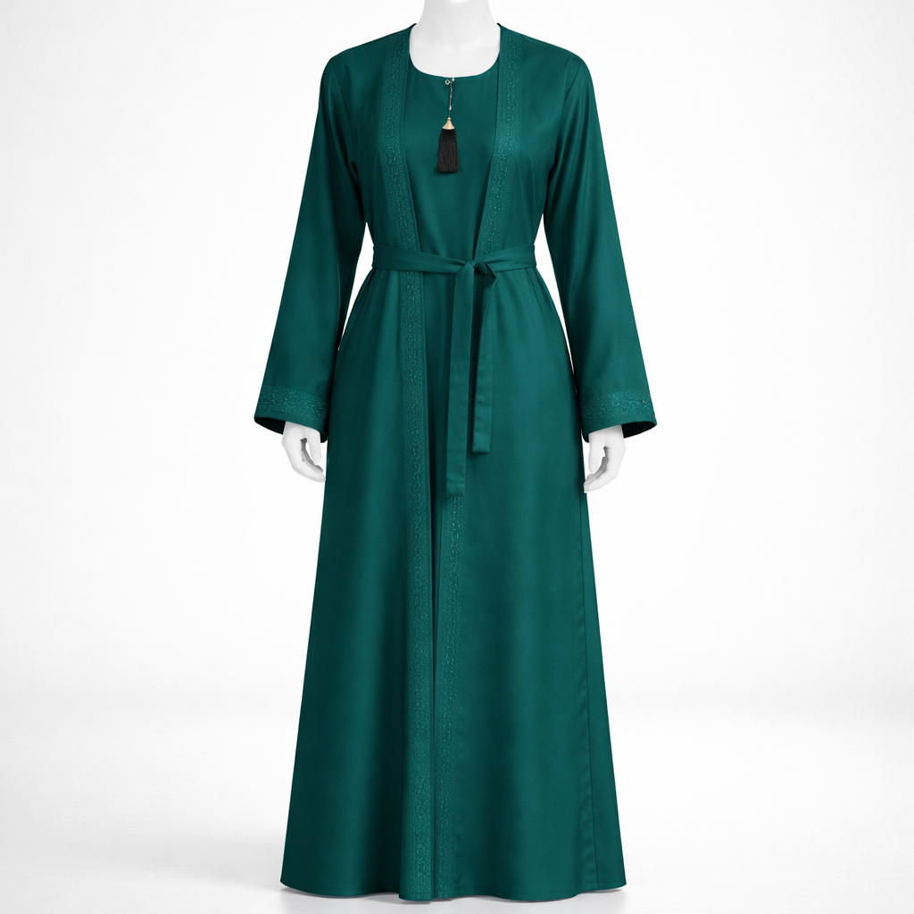 Enhance your modest wardrobe with this Elegant Green Belted Abaya with Inner, designed for modern women in Pakistan who love a blend of sophistication and comfort. This stylish 2-piece abaya features a front open design with a matching inner, giving you a layered, graceful look.