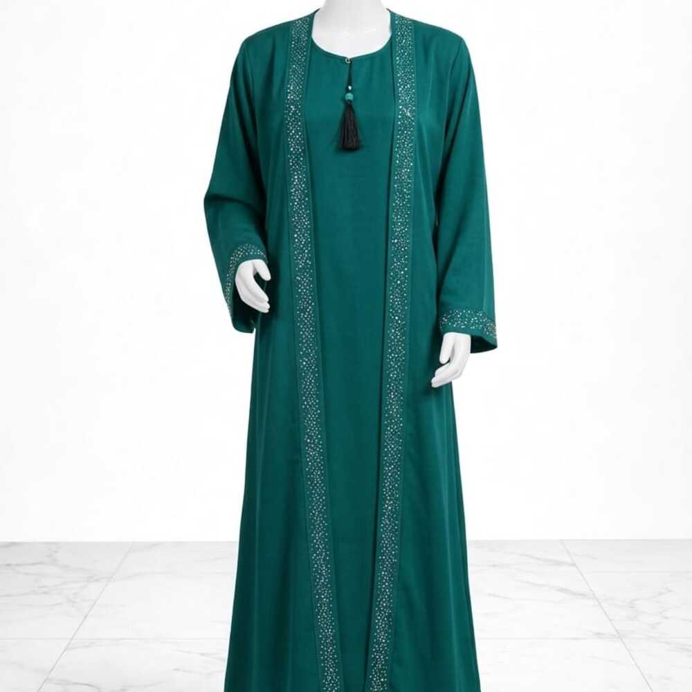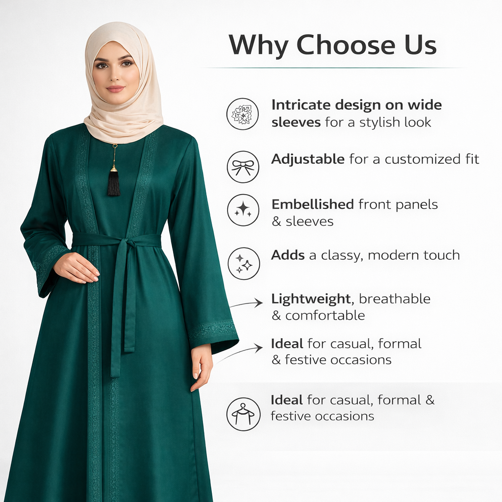 • 2-Piece Abaya Set: Includes a front open outer abaya with a matching inner for a complete and elegant modest look.