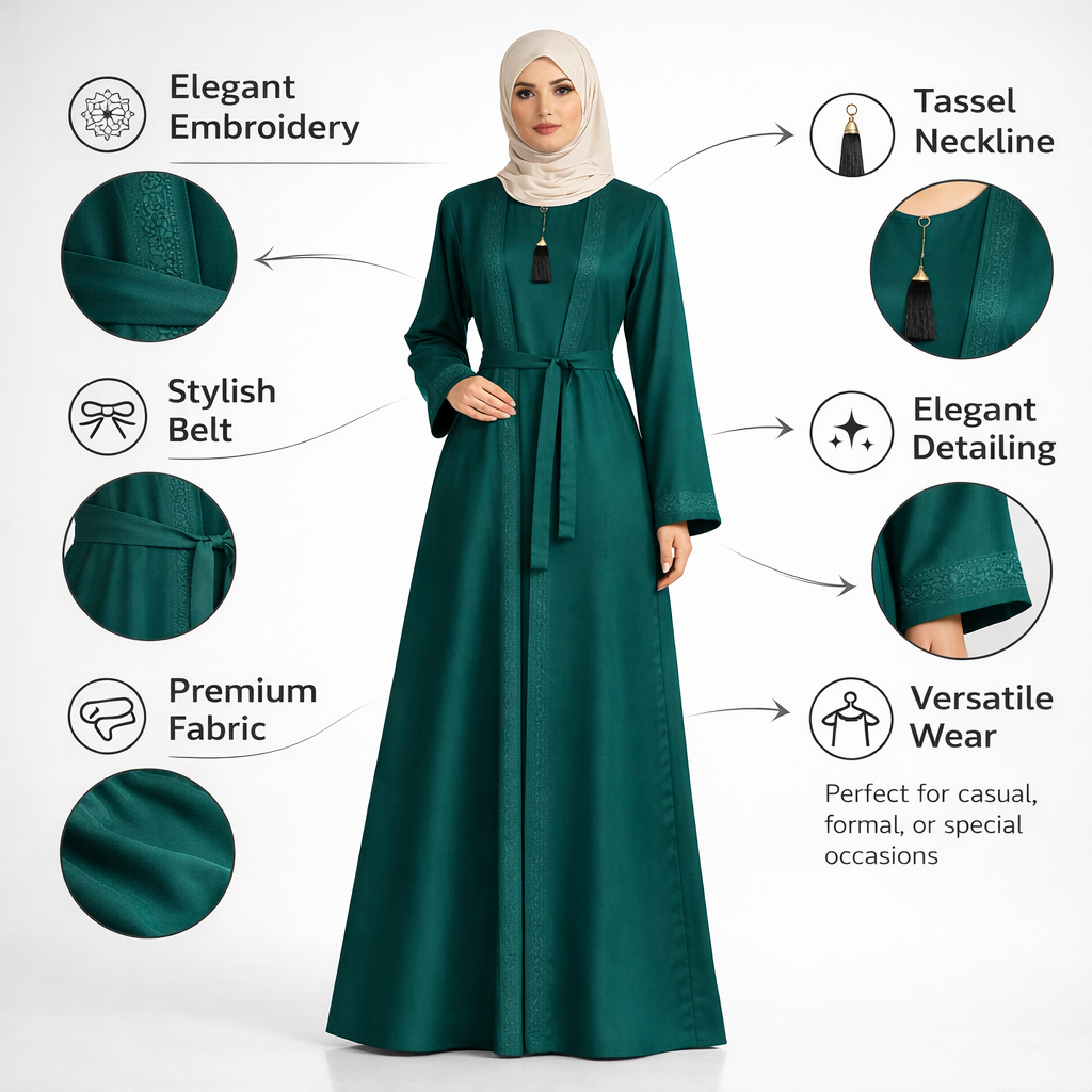 Stay effortlessly stylish with this Elegant Green Belted Abaya with Inner, featuring a graceful open design and adjustable waist belt for a perfect fit. Made from premium, breathable fabric with subtle embellishments and a tassel neckline, it’s ideal for everyday wear and special occasions in Pakistan.