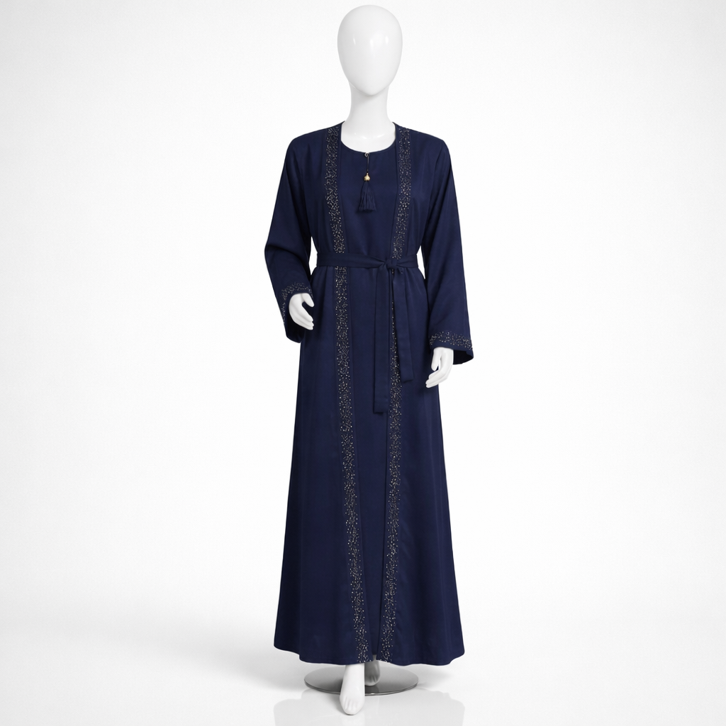 Enhance your modest wardrobe with this Elegant Navy Blue Belted Abaya with Inner, designed for modern women in Pakistan who love a blend of sophistication and comfort. This stylish 2-piece abaya features a front open design with a matching inner, giving you a layered, graceful look.