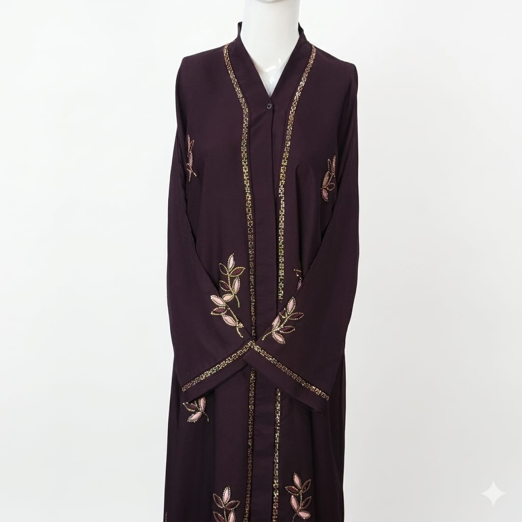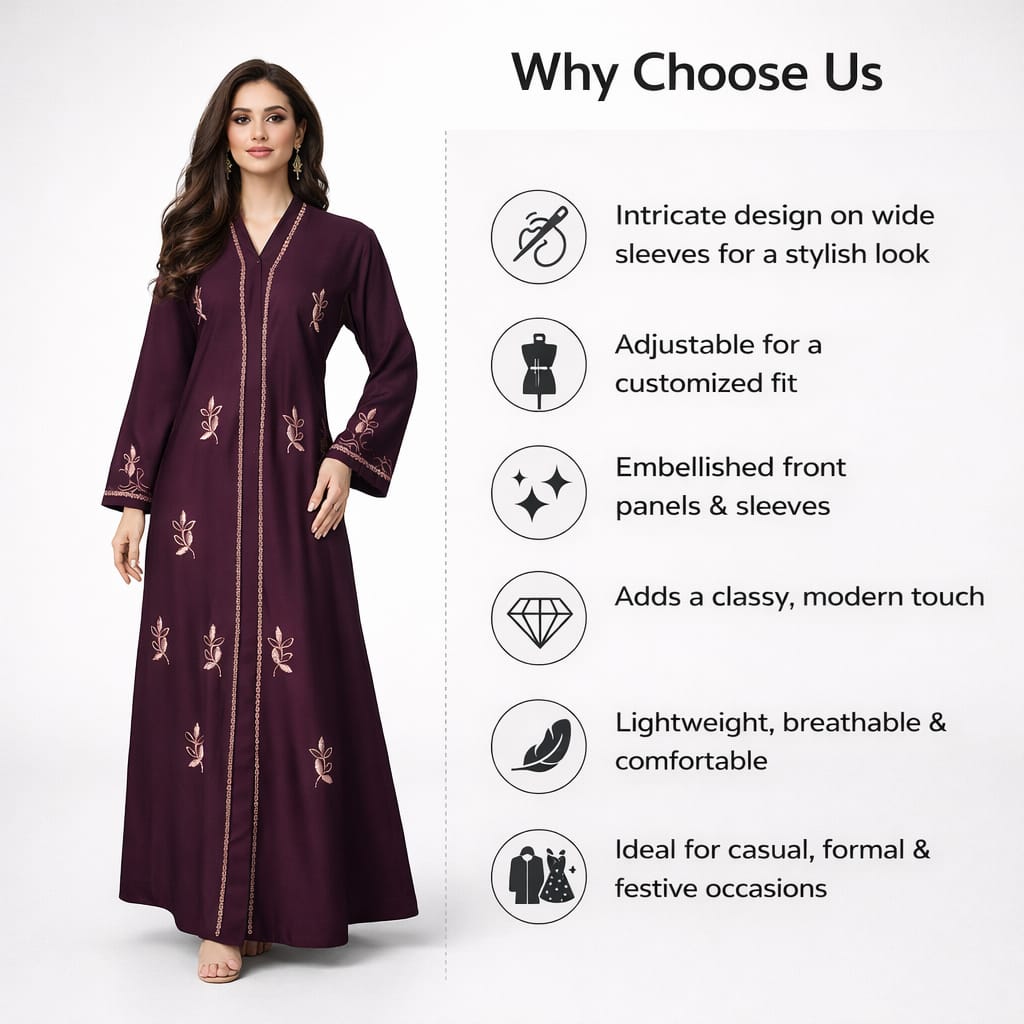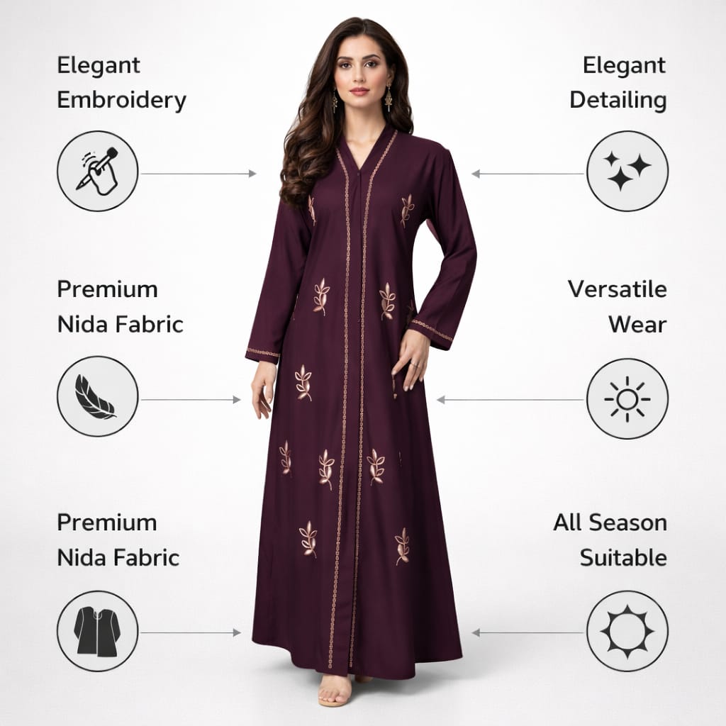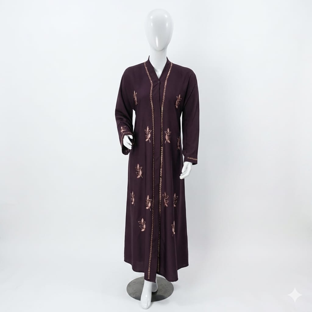 The rich plum brown color gives this abaya a luxurious and refined appearance, while the delicate floral embroidery adds a touch of femininity and elegance. Whether you want an abaya for daily wear, work, family gatherings, prayer, Eid celebrations, Umrah, or formal events, this design offers versatility and timeless charm.